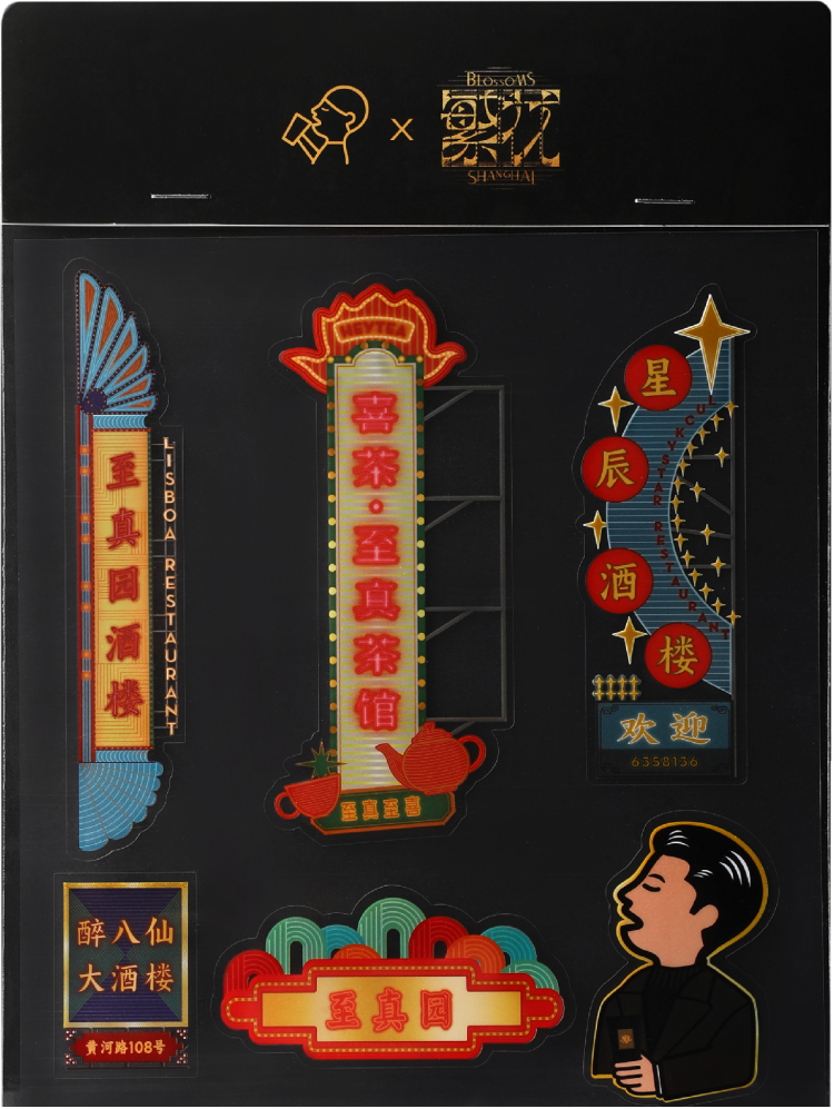 而联名贴纸周边则把目光放在了《繁花》剧集中最令人印象深刻的故事场景——黄河路上。剧中的黄河路酒楼饭店林立,入夜后灯火煌煌,各路人物走马灯般上演种种情节。通过在黄河路上展开的众多故事场景,王家卫导演独特的视觉风格、对光影的理解和把握均表现得淋漓尽致。喜茶选取黄河路上的各色店家灯牌,结合剧中美术原型进行贴纸形象的创作设计。如喜茶·至真茶馆灯牌贴纸,是以金美林酒楼为原型,顶部融入白玉兰花元素,搭配代表喜茶的茶碗、茶壶共同创作。而茶馆也是上海城市文化的重要载体之一。至真园酒楼灯牌、霓虹灯贴纸,则是参考剧中的“至真园”进行颜色重新定制后的呈现效果。