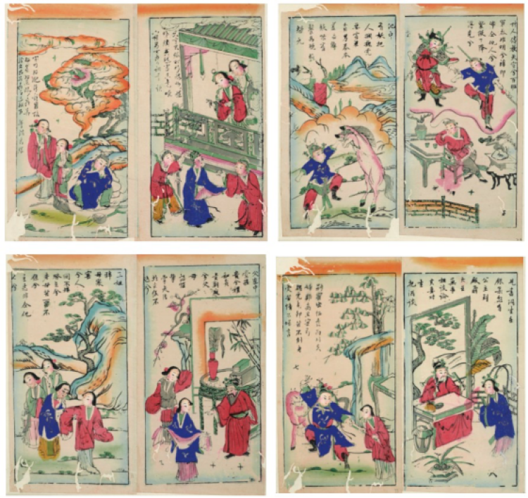 本次展览涵盖了三裁、斗方、竖披等常见的年画形式。它们有些来自声名赫赫的中国四大年画产地天津杨柳青与山东潍坊杨家埠,也有更具本地色彩的上海小校场年画。观众可以在观赏杨家埠的《红鬃烈马》八条屏时感受戏曲年画如连环画般的目不暇接,也可在上海小校场店铺孙文雅的《蚕花茂盛》里想象江南妇女彩衣花衫、忙碌农桑。