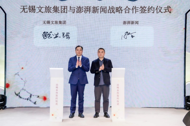 作为此次活动的联合主办方,澎湃新闻携手无锡文旅集团,在发布会现场共同签署战略合作协议。据了解,未来双方将针对文体旅、文商旅发挥各自优势,积极推进项目调研与投促落地,举办长三角主流媒体无锡行,以及在旅游新营销、新消费、品牌打造与媒介传播等方面进行合作。