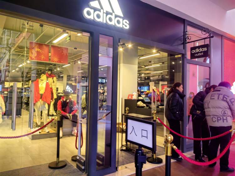 在阿迪达斯、耐克等一些运动品牌商店外,为了分流设置了出口和入口专用通道,三五成群走进和提着大小购物袋出来的人络绎不绝。
