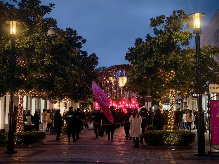 夜幕降临时,比斯特购物村的街上出现了锣鼓声,一支30米长的舞龙队伍吸引了不少正在购物的人探头观望,“一群人跟着舞龙的队伍一起招摇过市,蛮闹猛啊”,当记者偶遇舞龙巡游队伍,一旁的爷叔小声嘀咕,原来爷叔陪着爱人逛了一下午,买完正准备回家,发现夫人早已经凑热闹跟着舞龙队伍一起向前走远了。
