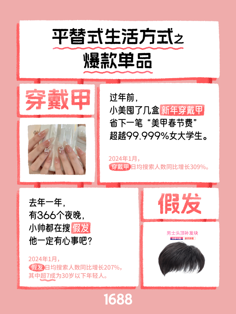 源头平替成了年轻人的消费新主张。大量年轻人涌入 1688,春节回乡之前上 1688 严选购买穿戴甲和假发,甚至找工厂定制。