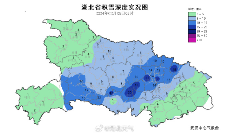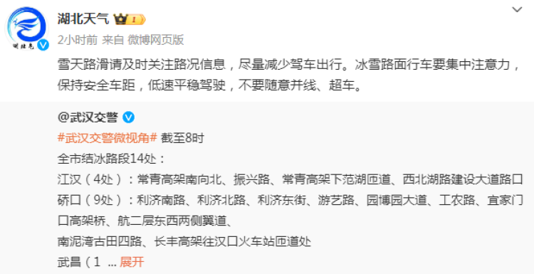 目前,湖北、湖南、安徽等地降雪仍较强,河南、山东南部、安徽中北部、江苏北部、湖北中东部、湖南北部等地仍有积雪。截至今晨湖北大部地区积雪深度达1至20厘米,武汉交警仍在发布全市结冰路段信息。