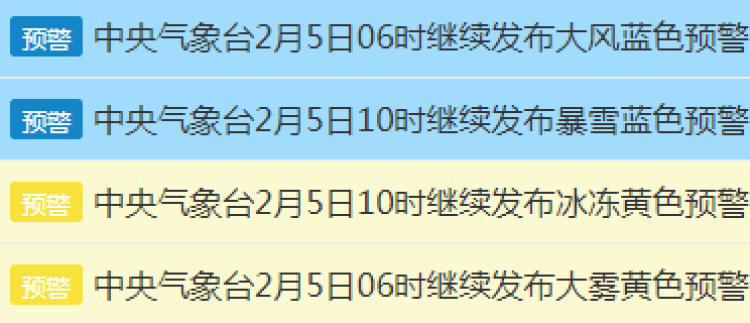 目前,中央气象台四预警高挂:大风蓝色预警、暴雪蓝色预警、冰冻黄色预警、大雾黄色预警。