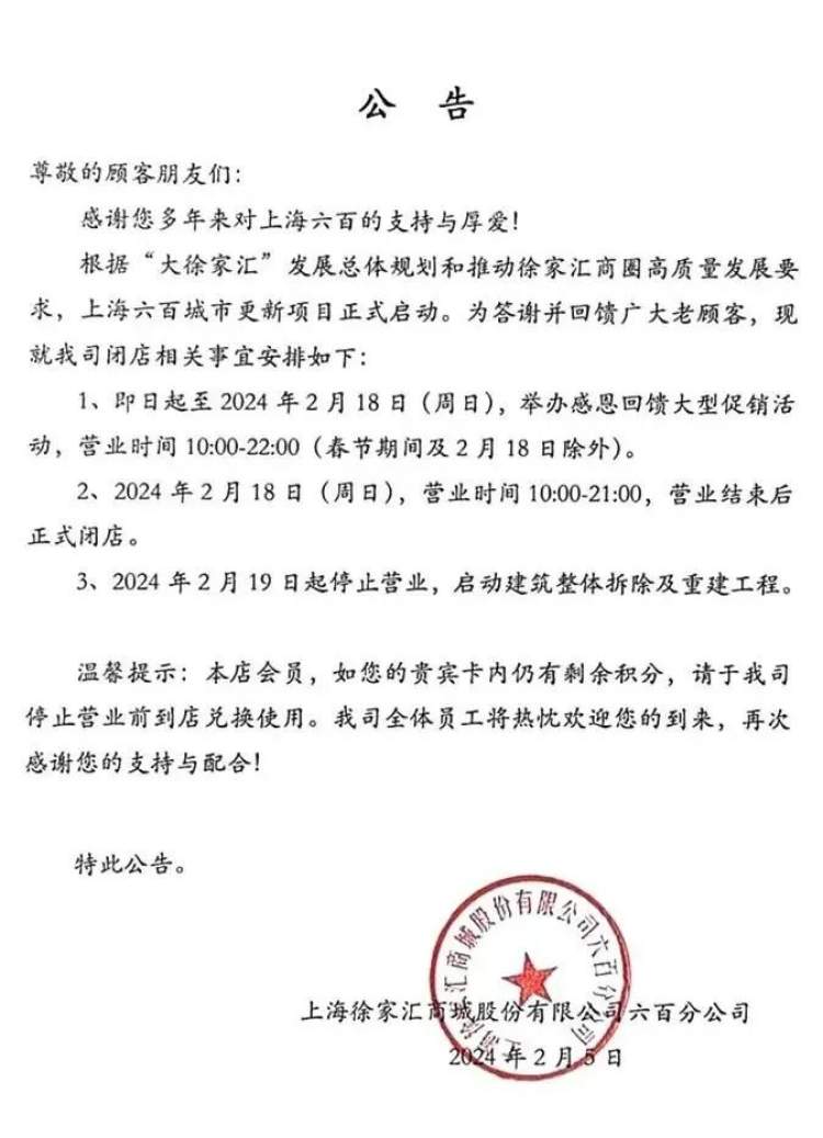 2月5日中午,上海六百在其官方公众号上发布公告称,将于2月19日起停止营业,并启动建筑整体拆除及重建工程。沪上又一老牌商场即将停业,记者在商场现场看到,各商铺推出春节促销折扣,不少市民照常前来逛商场,得知停业的消息后,表示“虽然失落但早有心理准备”,并期待未来“上海六百转型回归后还是亲民的定位”。