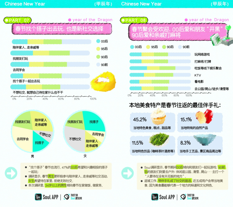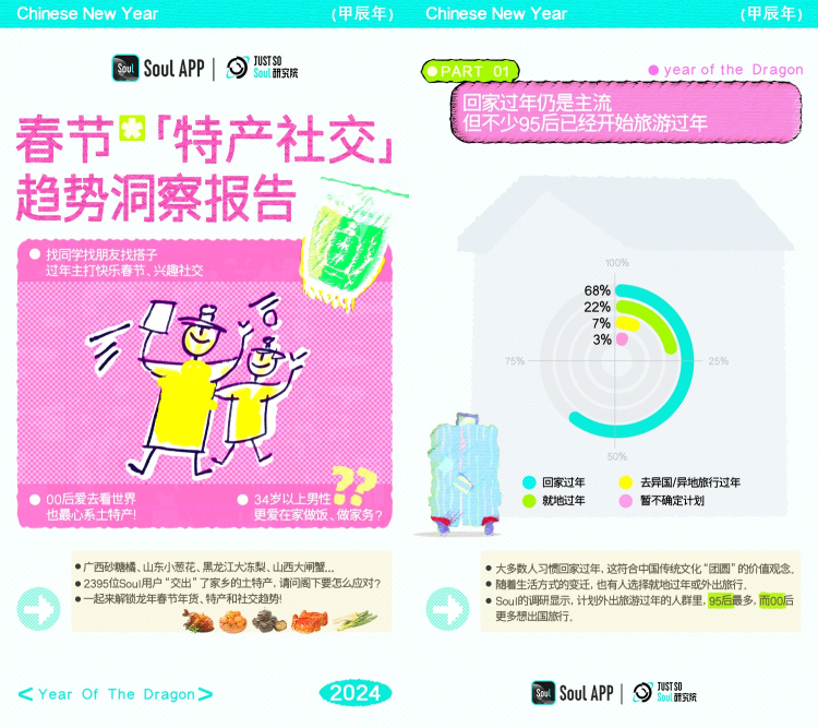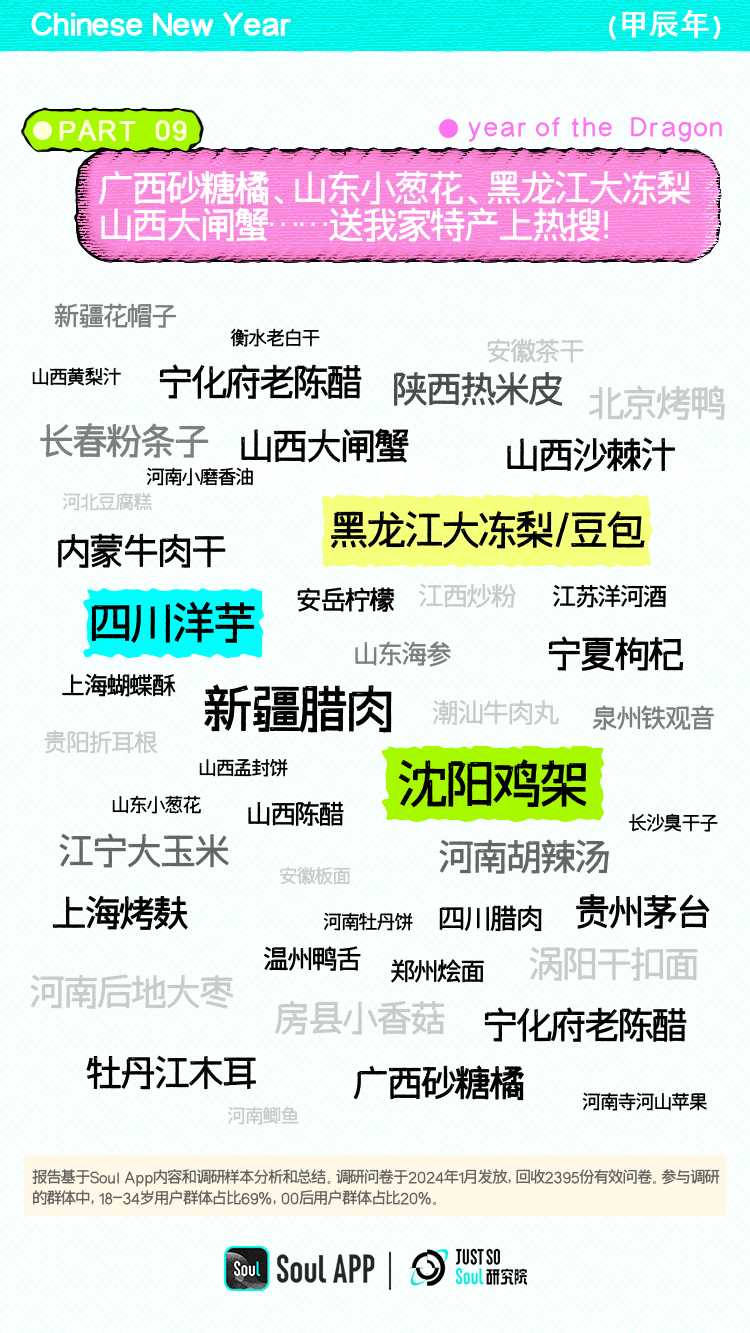 作为深受年轻人喜爱的社交平台,Soul的用户年轻、活跃、兴趣广泛。此次报基于平台内容和2395份调研样本,深入剖析18-34岁用户群体(尤其是00后用户)在春节期间的特产消费新习惯和社交新方式。