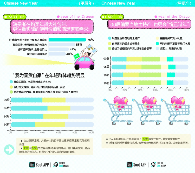 根据Soul调研的发现,大部分人购买年货注重家庭需求和实际使用价值。而95后和05后关注自我情绪满足的商品,他们爱买国货、老品牌推出的大礼包,这也是文化价值认同和品牌自豪感的体现。