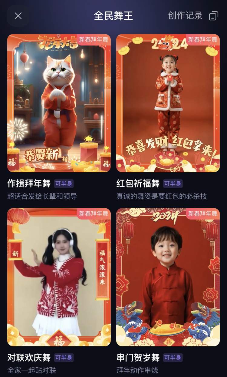此外,一个月前火爆全网的全民舞王应用也迎来上新,用户可通过一张照片生成拜年视频,用更轻松、接近真人出镜的方式向亲朋好友传递新年的美好祝福。