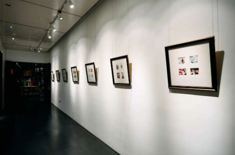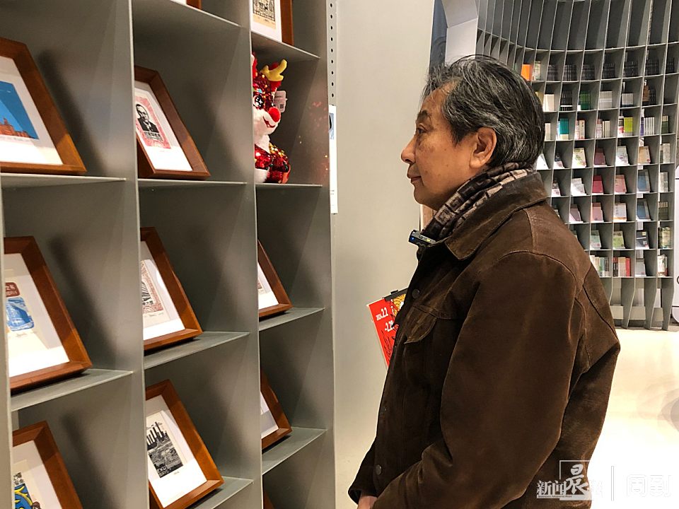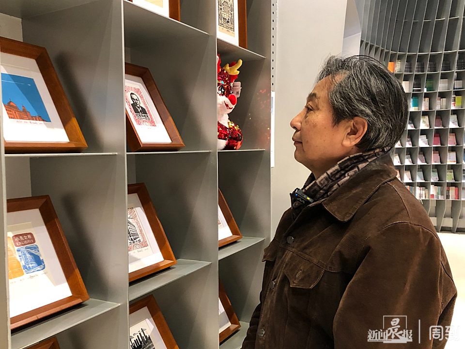金大鹏在思南书局诗歌店看展陈的藏书票作品