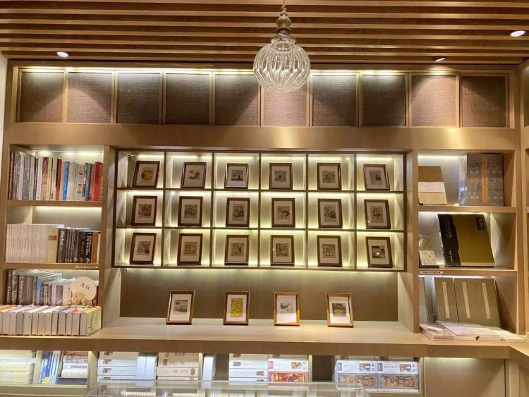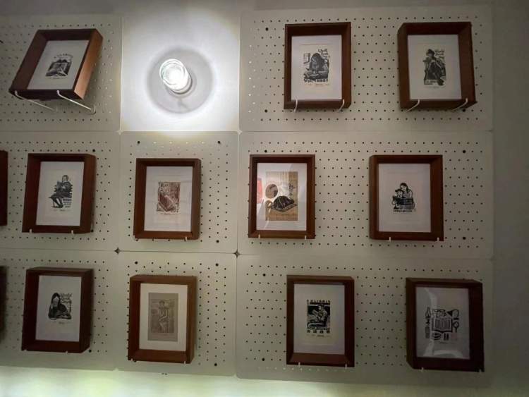 这次,上海世纪朵云旗下的七家书店联合举办金大鹏的藏书票展览,朵云书院旗舰店的藏书票为名人主题,朵云书院戏剧店的藏书票为生肖主题,思南书局诗歌店的藏书票为建筑主题,其中有邬达克设计的国际饭店、武康大楼,这次刚刚新开业的朵云书院枫泾店,藏书票为成语加龙年主题。