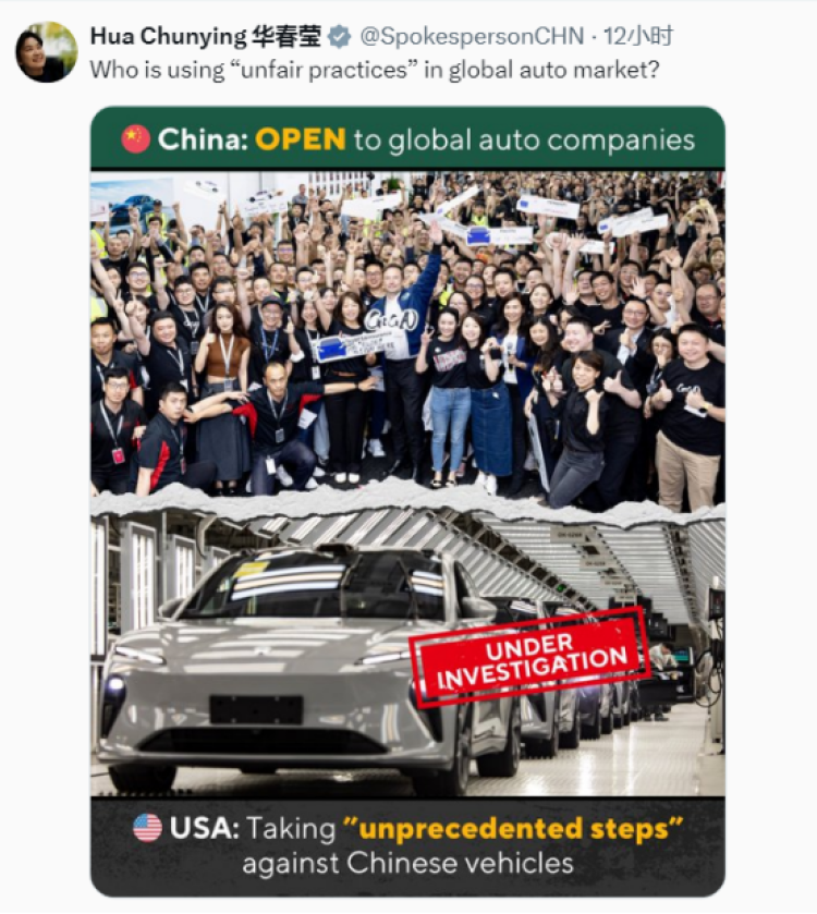 她随后发表图文,对比中美在汽车行业的行为问道,“是谁在全球汽车市场采取‘不公平做法’?”图片显示,中国的做法是“向全球车企”开放,而美国正针对中国汽车采取“前所未有的措施”。↓