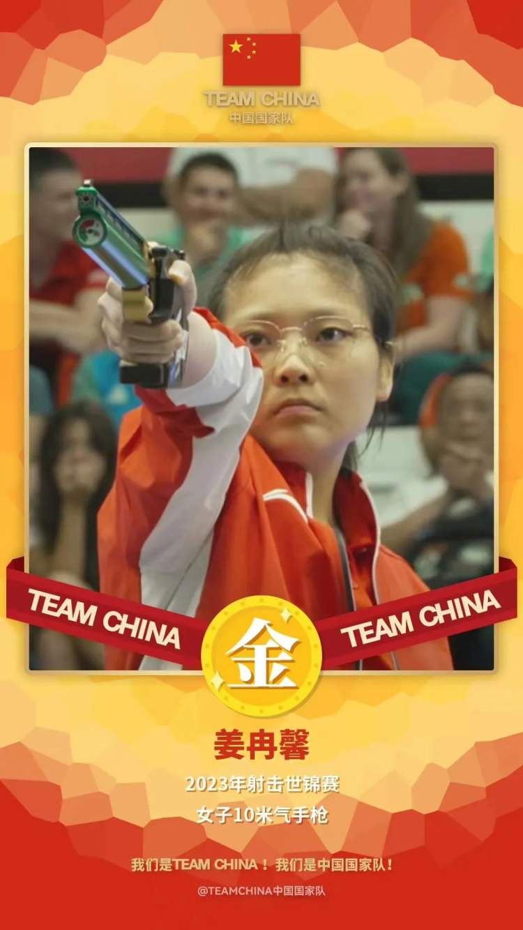 女子10米气手枪团体比赛,姜冉馨、李雪、钱微组成的中国队以1728环的成绩收获金牌。