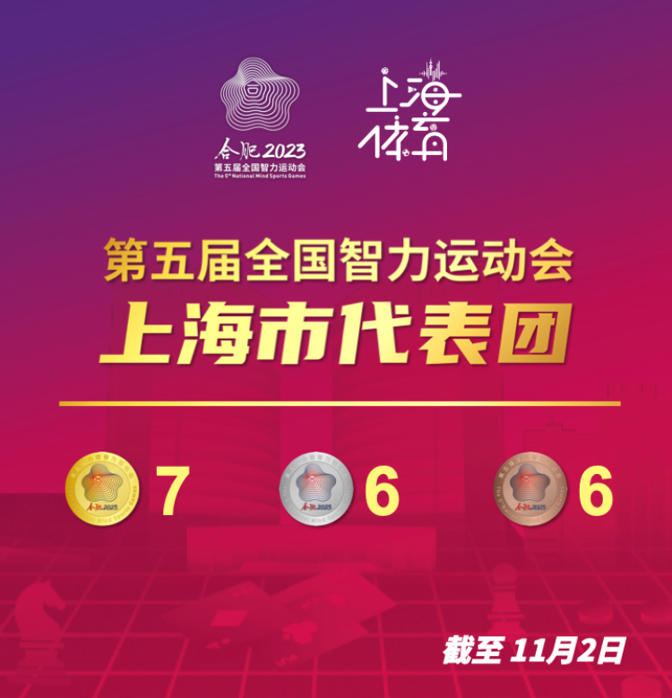 象棋赛场,大学生混合团体(第5-6轮),上海队第5轮平天津,第6轮胜河北,总成绩5胜1和积11分,暂列第2,还有1轮比赛;专业男子团体(第3-4轮),上海队第3轮胜北京,第4轮对冲胜浙江,总成绩4胜积8分领跑,还有3轮比赛;公开女子个人(第5-6轮),上海宇诗琪4胜1和1负积9分,暂列第3,还有1轮比赛。