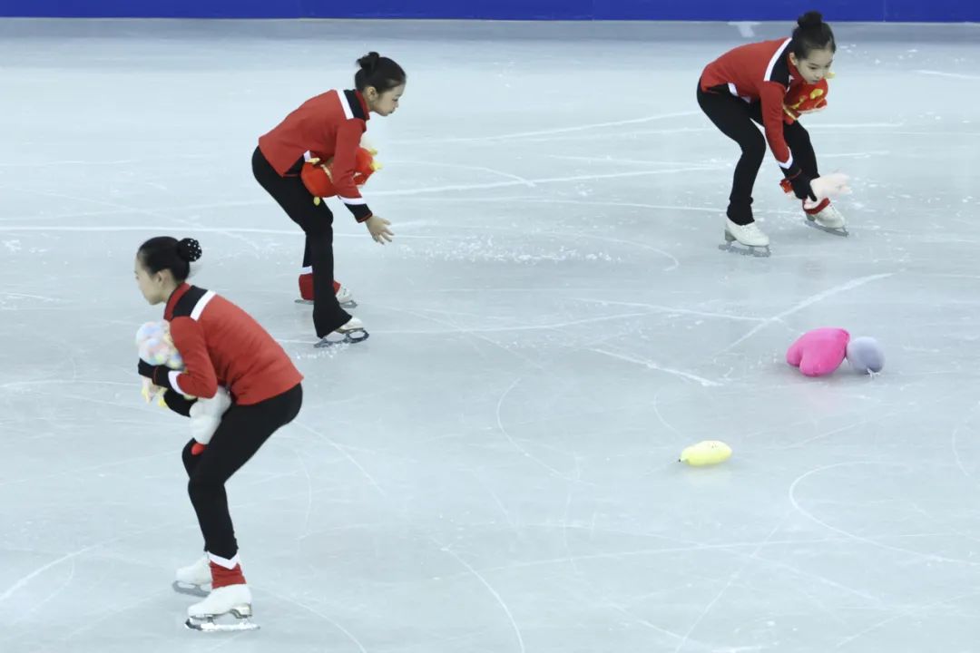 选手一曲滑毕,就到了冰童大展身手的时刻。这些机灵的小家伙踩着冰刀滑上冰场,拾起观众抛下的毛绒玩偶,将冰面打扫干净后迅速归位,目不转睛地盯着赛场。全情投入的样子,“谋杀”了不少摄影师的胶片。