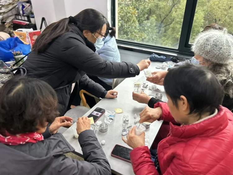 本次活动邀请专业配方师前来授课,现场实操制作面霜。活动过程中,老师一边讲解一边示范,大家按照要求在杯中加入水、甘油、橄榄油等原料,混合过后加入乳化剂等各种材料进行搅拌,均匀成型完成后倒入罐中。在老师的指导下,不一会儿,一瓶瓶精致且健康无添加的面霜就做好啦。学员们还迫不及待地试抹了面霜,开心地享受自己动手制作的成果。大家相互分享经验,晒出自己的作品,充满成就感。此外,授课老师还在现场为学员们答疑解惑,普及常见护肤品的作用和功效,一对一解答皮肤保养问题,寓教于乐,现场氛围其乐融融。