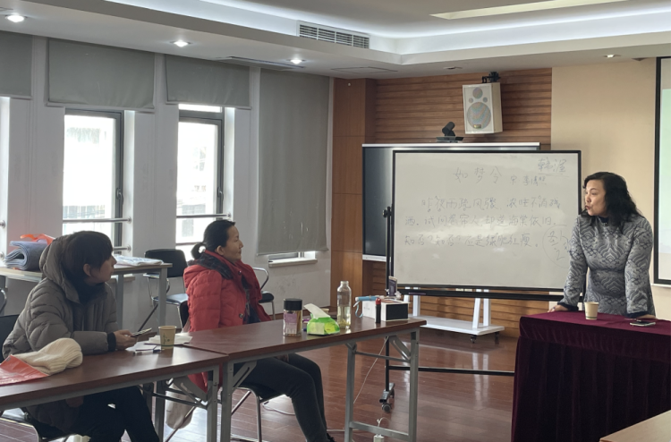 《如梦令》是李清照的代表作,此词借宿酒醒后询问花事的描写,委婉地表达了作者怜花惜花的心情,充分体现出作者对大自然的热爱,也流露了内心的苦闷。通过老师的教学,学员们学习了诗词的基本规律,诗词讲究对仗工整,平仄相对,讲究押韵、讲究意境。随后,慧涓老师对《如梦令》进行逐句解析,大家兴致盎然地一起探讨《如梦令》的意境,各抒己见,相互交流。