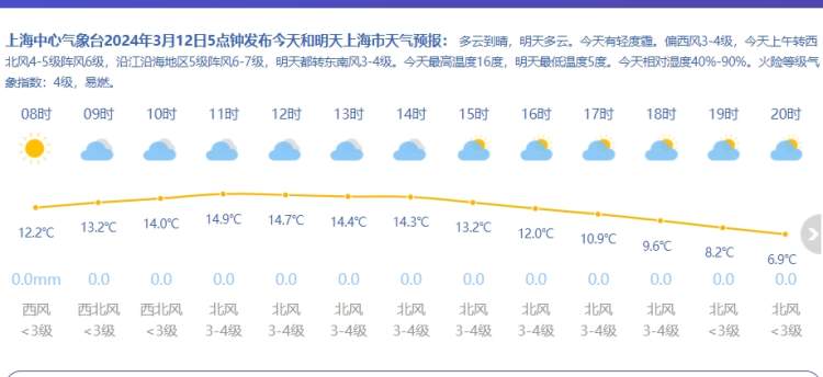 申城今天是多云到晴的天气,阳光在线。预计白天最高气温在16℃上下。今天风力有所增大,上午转西北风4-5级阵风6级,相对湿度90%~40%。轻暖轻寒的节奏里,着装上还不能太单薄。