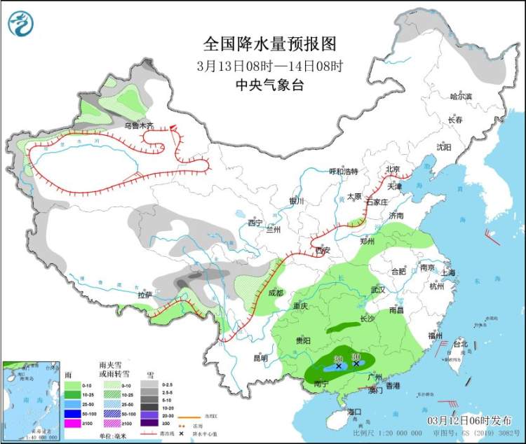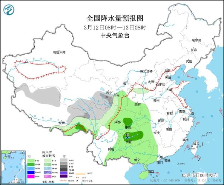 根据中央气象台预报,3月12日08时至13日08时,西藏北部和东部、青海南部、甘肃南部、陕西北部、川西高原中北部等地部分地区有小雪或雨夹雪,其中,西藏东北部、青海东部、甘肃南部等地部分地区有中到大雪。西北地区东南部、江汉西部、江南北部和西部、西南地区东部、华南西部等地部分地区有小到中雨,其中,贵州中北部等地部分地区有大雨。