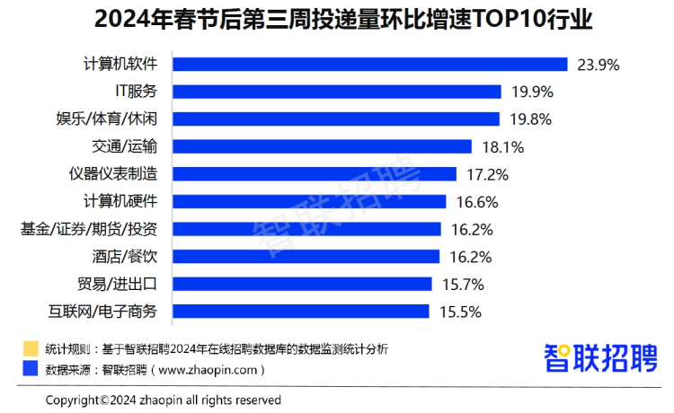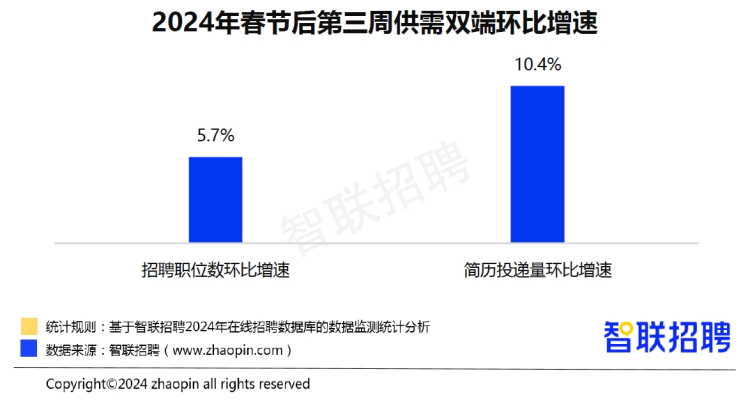 2024年政府工作报告指出,要“多措并举稳就业促增收”,“就业是最基本的民生”。春节后第三周,春招市场已呈现热度升温的态势。智联招聘平台数据显示,节后第三周招聘职位数环比第二周增长5.7%,简历投递量环比增长10.4%,人才供需继续攀升。