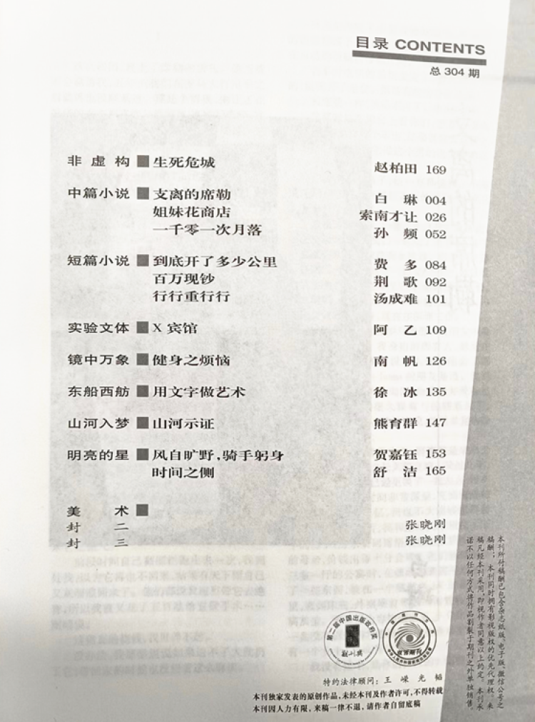 记者注意到,2024年第2期《收获》封面为蓝色。翻开这期刚刚出版的杂志,非虚构有赵柏田的《生死危城》,中篇小说有白琳的《支离的席勒》,索南才让的《姐妹花商店》,孙频的《一千零一次月落》,短篇小说有费多的《到底开了多少公里》,荆歌的《百万现钞》,汤成难的《行行重行行 》,另外还有阿乙的《X宾馆》,南帆的《健身之烦恼》,徐冰的《 用文字做艺术》。