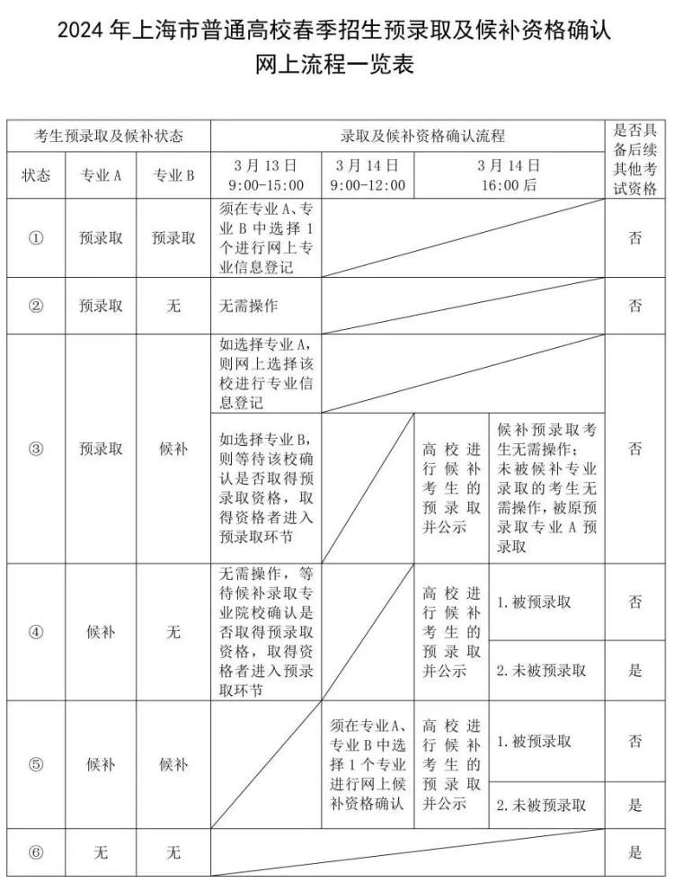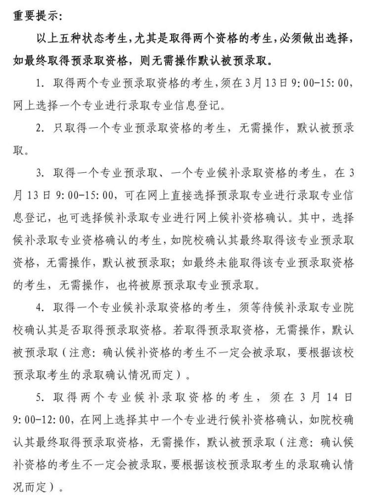 3. 取得两个专业候补录取资格的考生,须在3月14日9:00-12:00,在网上选择一个专业进行候补资格确认,如院校确认最终取得预录取资格,默认被预录取,无需操作。