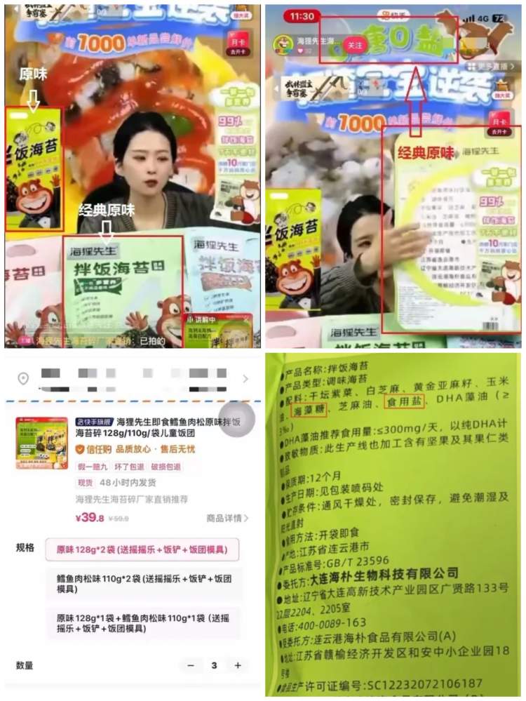 在“海狸先生海苔碎厂家直销”直播间,市消保委对一款名为海狸先生拌饭海苔产品的调查中发现,直播间背景宣传“0糖0盐”;主播面前共出现4种颜色/包装口味的产品,右下角购物车显示讲解中的产品配图为海狸先生即食鳕鱼肉松原味拌饭;主播在讲解配料表时以原味、经典原味举例:“只有白芝麻、黄金亚麻籽、玉米油、芝麻油、橄榄油、海藻油,配料表干干净净的,经典原味,孩子们6个月以上,能吃辅食的都是能吃的,0盐0糖,高钙、高铁、高硒”。实际收到样品包装为原味口味,其配料表中却添加了海藻糖、食用盐,主播宣称与产品配料不符。