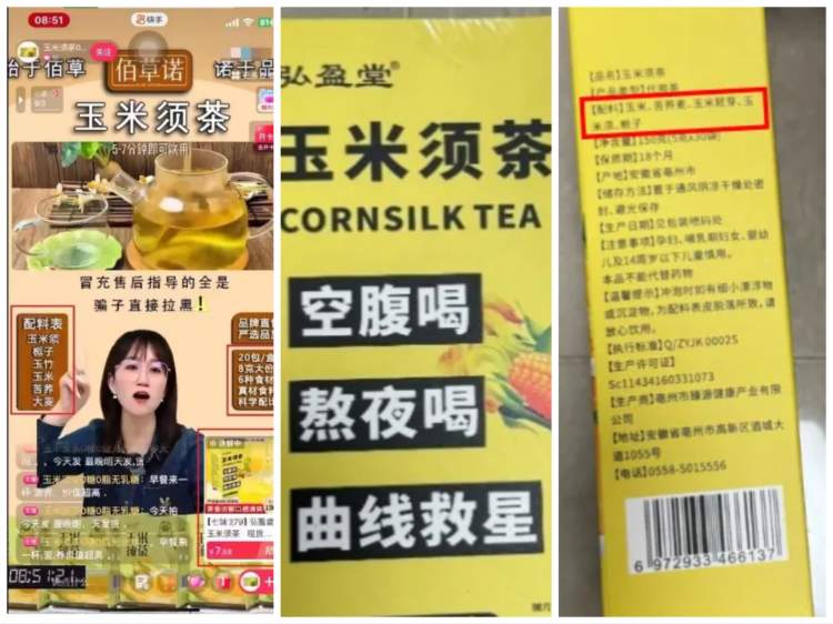 在“玉米须茶0糖0脂无乳糖”直播间购买的一款名为玉米须茶的调查中发现,直播间背景宣传“玉米须茶0糖0脂无乳糖”;主播口播宣传“6种食材科学配比,里面有玉米、玉米须、大麦、栀子、苦荞、玉竹,不含糖、不含色素、不含香精、不含防腐剂”。视频右下角讲解中画面配图为“玉米须茶150g”;主播左手配图为“配料表:玉米须、栀子、玉竹、玉米、苦荞、大麦”;右手配图为“20包/盒、8克大分量、6种食材、真材实料、科学配比”。实际收到包装为玉米须茶,净含量为150克(5克×30袋),配料表为:玉米、苦荞麦、玉米胚芽、玉米须、栀子,并非视频中体现的“20包/盒、8克大分量、6种食材”,存在主播宣称与产品信息不符。