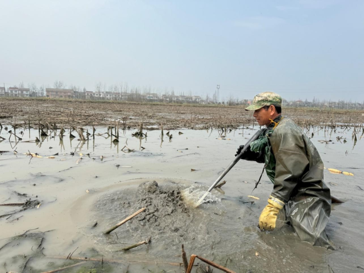 邱珍兵跟在师傅后面。只见老师傅先将淤泥挖出来一个半米的深坑站在里面,凭着经验找准莲藕卧在淤泥的哪个位置。一年后,邱珍兵才掌握了怎么找莲藕:那些又细又韧的荷梗下方就是莲藕的头,尾部通常有两根相邻的荷梗。