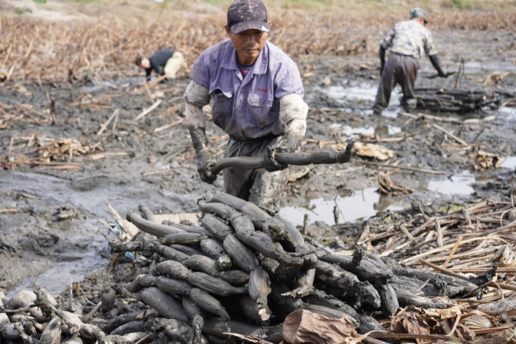 从2019年,每年9月份开始,万亩荷塘就迎来各地50多名挖藕人,他们两个人每天负责1.5亩荷塘,平均每人每天挖六七百斤,挖干净一片荷塘就换另一片,这样可以连续工作到年前高的时候,挖藕工每天可以挖1000斤藕。