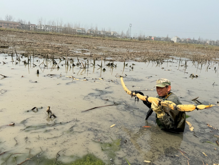 赵道凯已经在湖里泡了三天时间挖莲藕,做着这一季挖藕的收尾工作。过完年回来,湖北的冻雨打断了赵道凯继续干活儿的行程。天气放晴,他成了这片湖里唯一的挖藕人。