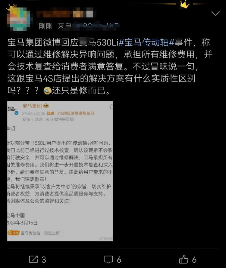 从宝马官方给出的回应看,还是修而已,这根宝马4S店提出的解决方案有什么实质的区别吗?