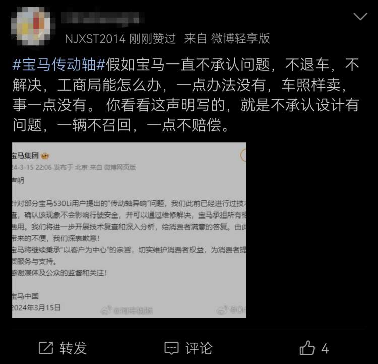 有着相同遭遇的宝马车主冯先生,2023年9月花48万元购买宝马530Li,提车回家大概10公里后,就发现汽车在D挡和R挡切换时,出现传动轴异响,这里的4s店给出的答复也如出一辙。