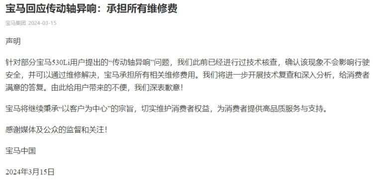在315晚会播出后不久,宝马发布声明回应传动轴异响问题,称“针对部分宝马530Li用户提出的“传动轴异响”问题,我们此前已经进行过技术核查,确认该现象不会影响行驶安全,并可以通过维修解决,宝马承担所有相关维修费用。我们将进一步开展技术复查和深入分析,给消费者满意的答复。由此给用户带来的不便,我们深表歉意!”