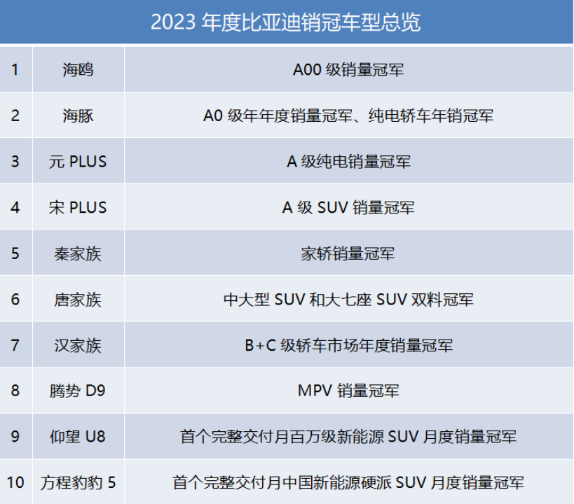 2023年,比亚迪冠军“遍地开花”。海鸥、海豚、元PLUS、宋PLUS、秦家族、汉家族、腾势D9、仰望U8、方程豹豹5等多款车型夺得细分市场销量冠军。