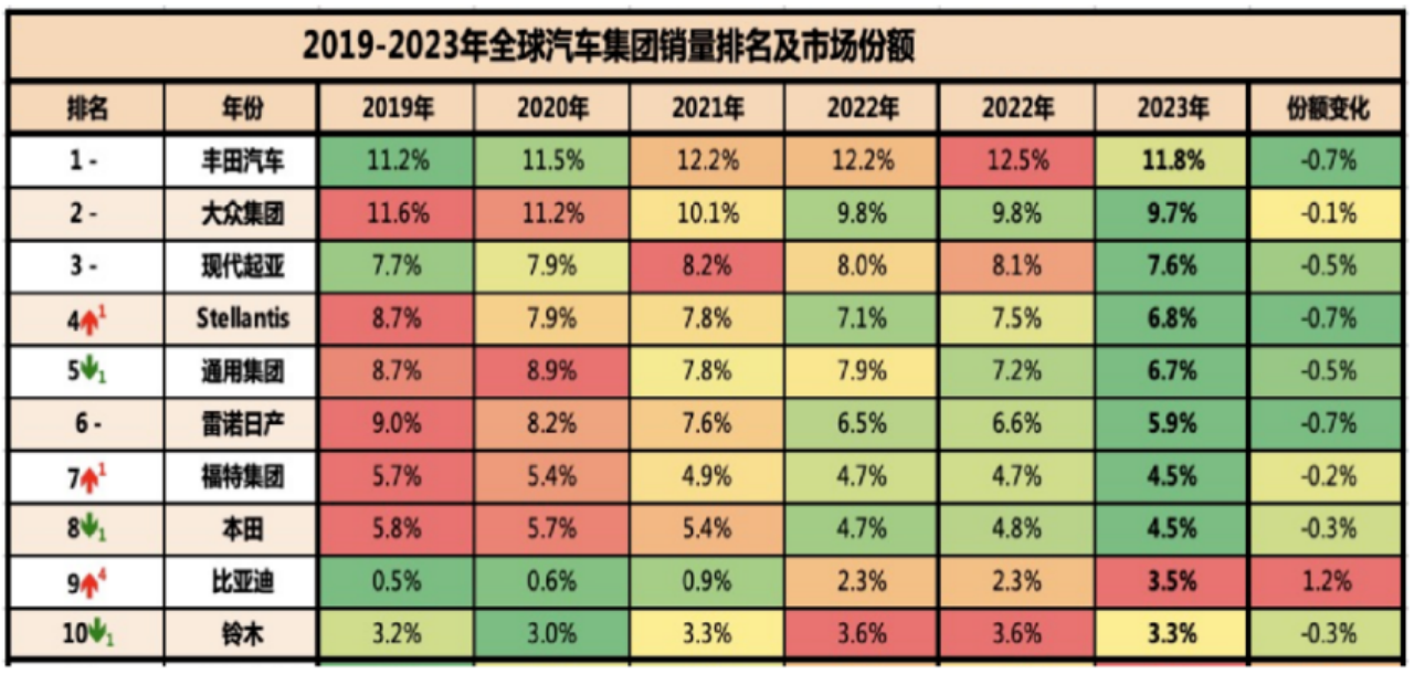 在全球市场,比亚迪不仅蝉联全球新能源汽车冠军,更是第一个也是唯一一个进入全球车企销量榜TOP10的中国品牌。2023年比亚迪在全球汽车集团销量中位列第9,是TOP 10中唯一市占率持续增长的车企。这是中国汽车工业史70年以来,中国品牌首次进入世界汽车销量前10。70年,三代人的努力,中国汽车工业实现了从“零基础”到“领航者”的转变。