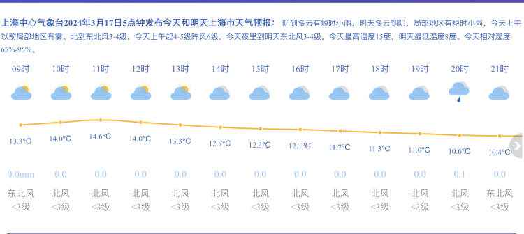 随着弱冷空气扩散,申城今日上午风力逐渐增大,北到东北风4-5级阵风6级。冷暖空气影响下,天空阴沉,白天为阴到多云有短时小雨。全天气温倒挂,市区早间就有14-15℃,体感较暖;晚间降至10℃附近,加上风大,体感要冷不少。