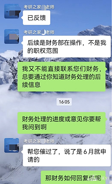 从去年10月份开始,王先生就在不断询问“考研之家”工作人员退费的进展,可是对方始终只有一句说辞,就是“已经在走流程了”。多催几次后,如今对方已经不再回复王先生的微信消息。