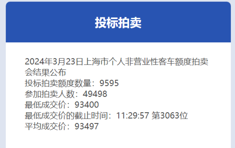 个人额度合计拍卖总数9595辆,参加拍卖人数49498人,中标率19.4%。最低成交价93400元,平均成交价为93497元,比上个月92842元增加了655元。最低成交价的截止时间是11:29:57第3063位。