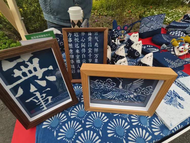 不过传统蓝印花布的图案主要是花鸟虫鱼、梅兰竹菊等,给人的印象是又老又土,很多年轻人不喜欢。所以我们在慢慢通过一些文创设计,包括图案、产品的创新,开发出年轻人喜欢的产品,这样非遗才有更持久的生命力。比如这个招财猫、龙鱼香囊,今天就有人买了。”摊位工作人员说。
