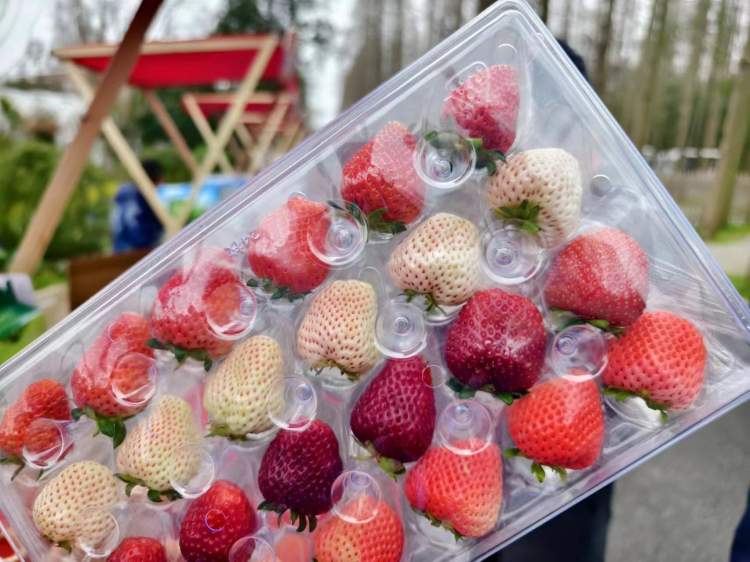 除了好玩的,现场还有不少好吃的。黑珍珠、粉玉、白雪公主、红颜……来自南通头桥村的“马卡龙色系”草莓让人眼前一亮,现场观众可以免费品尝草莓。