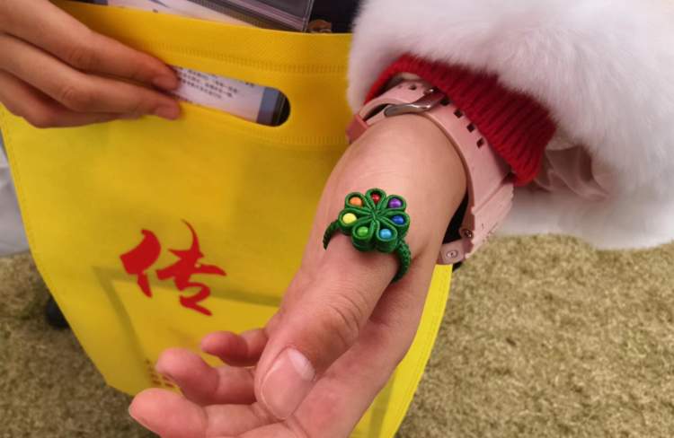 来自南通的学生小季对市集上的非遗很感兴趣,她买了个盘扣戒指,戴在大拇指上,“我觉得这个颜色很漂亮,绿色是我最喜欢的颜色,还有里面的珠珠和其他的不一样”。