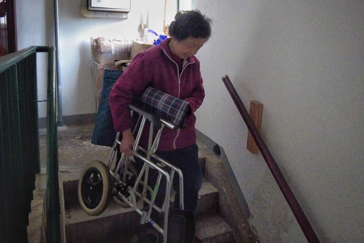 ▲如今每次出行,顾阿姨都需要将轮椅从六楼搬上搬下