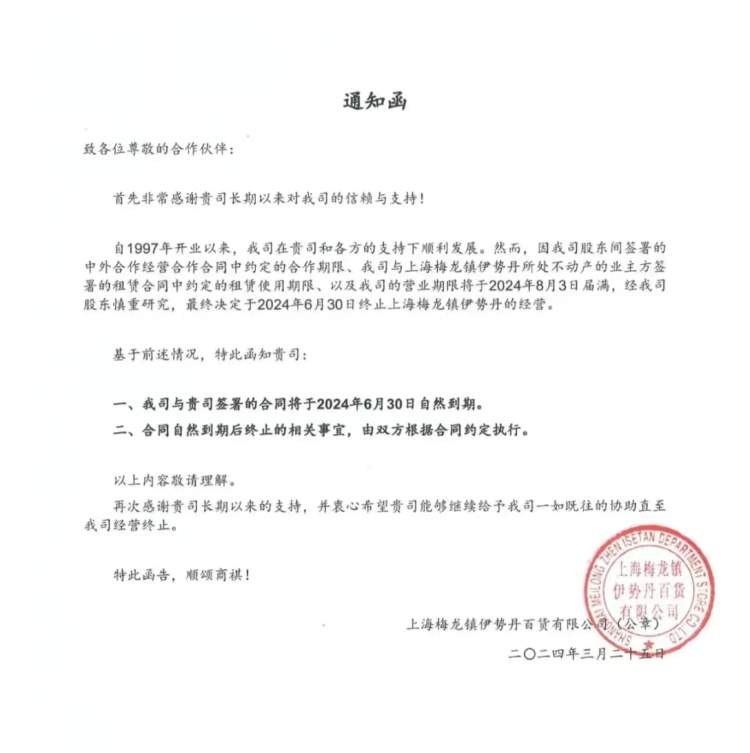 也有网友晒出由梅龙镇伊势丹百货有限公司发给合作伙伴的通知函,明确表示商场将于2024年6月30日终止经营,同时双方的合作也自然到期。