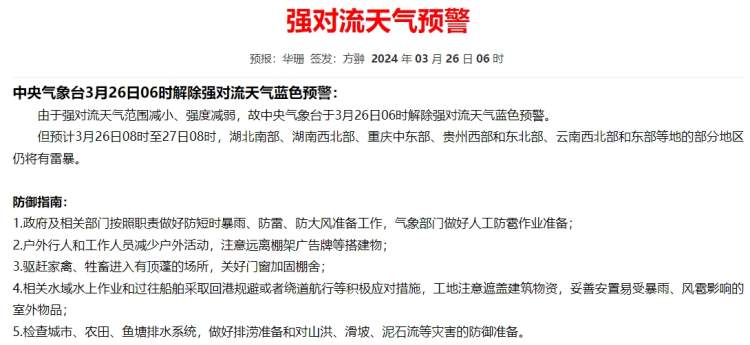 今晨6时中央气象台解除强对流天气蓝色预警,但预计3月26日08时至27日08时,湖北南部、湖南西北部、重庆中东部、贵州西部和东北部、云南西北部和东部等地的部分地区仍将有雷暴。