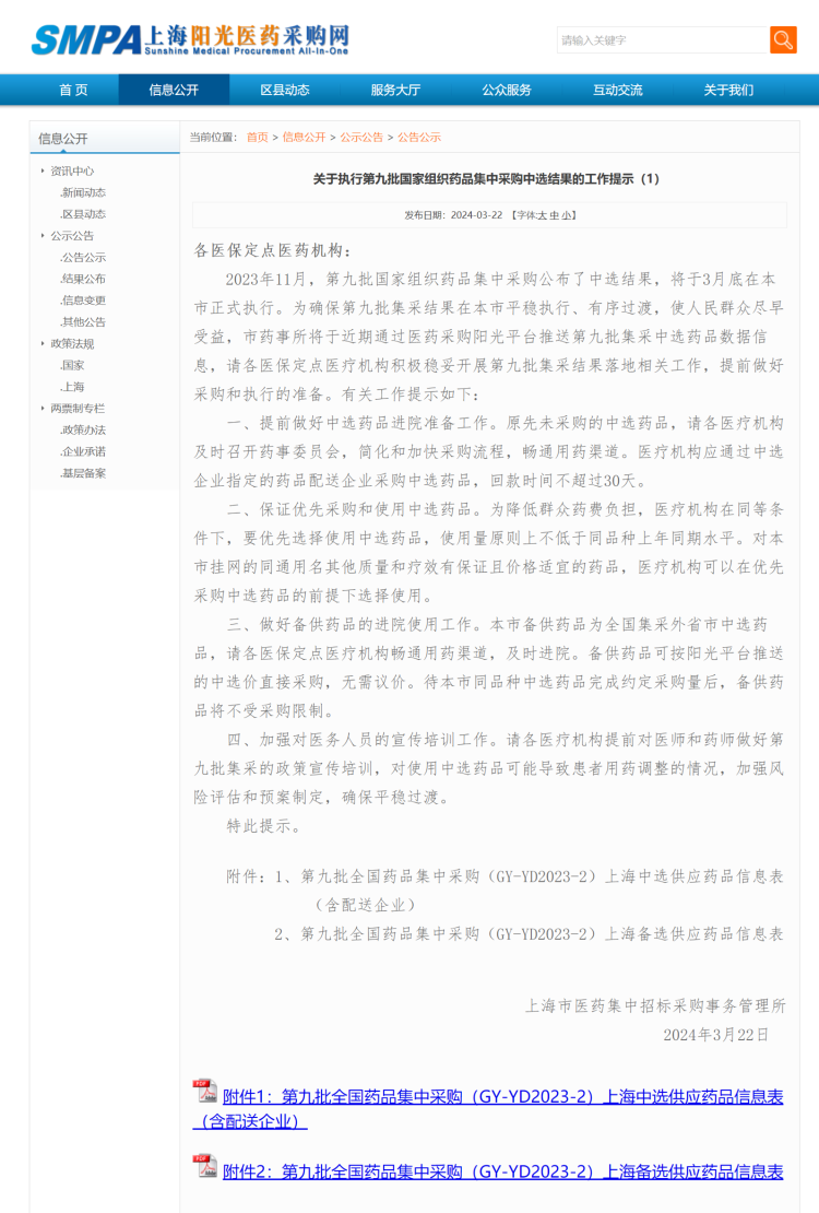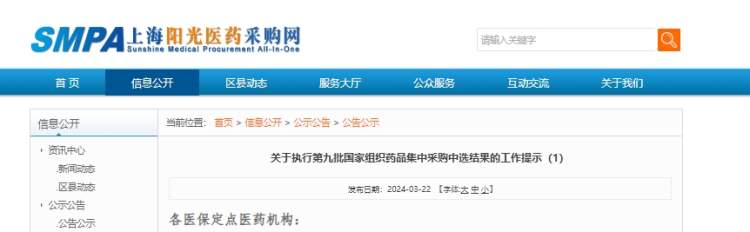 日前,上海市阳光医药采购网发布关于执行第九批国家组织药品集中采购中选结果的工作提示。