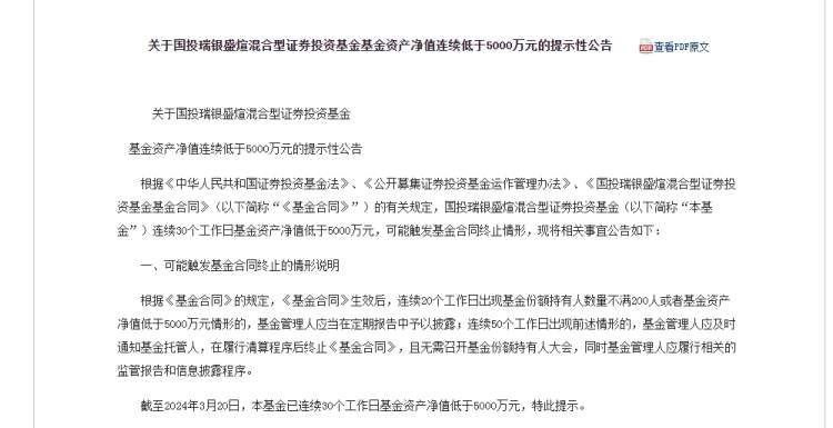 日前,国投瑞银基金发布的公告显示,截至3月20日,旗下国投瑞银盛煊混合基金,因为连续30个工作日,基金资产净值低于5000万元,从而发布提示性清盘预警公告。