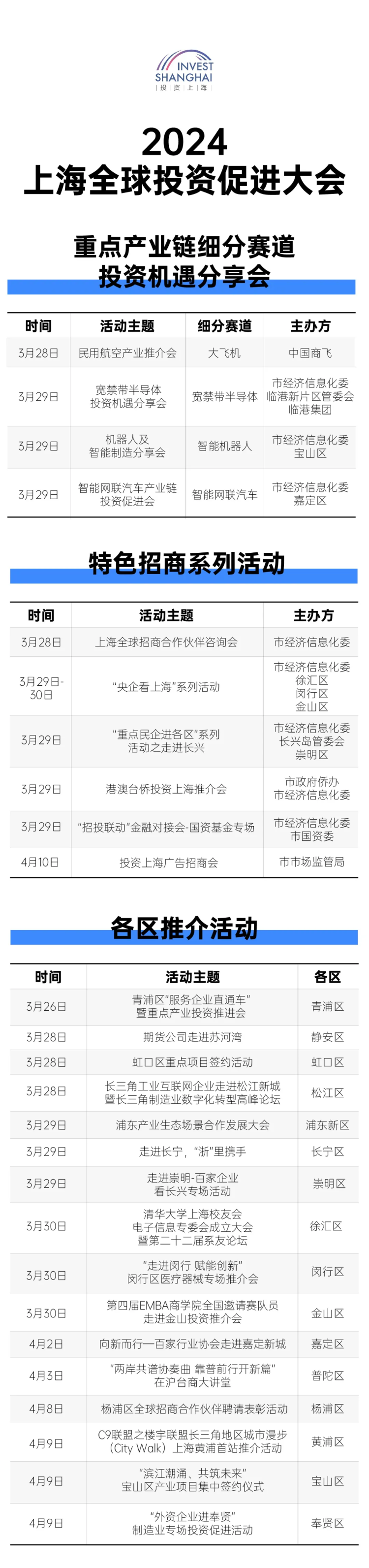 今年大会将新增重点产业链细分赛道投资机遇分享会、各区推介会、“央企看上海”“百家民企进园区”等多种形式的特色招商活动。同时,积极发挥基金、商协会、第三方机构作用,邀请企业参会,扩大活动覆盖面。