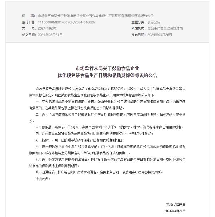 3月26日,市场监管总局发布《关于鼓励食品企业优化预包装食品生产日期和保质期标签标识的公告》,推动食品企业积极采取针对性改进措施,方便消费者清晰辨识。