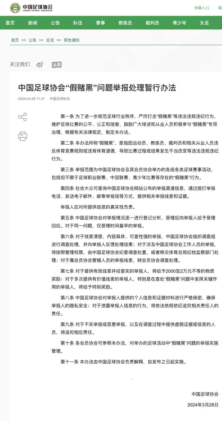 3月28日,中国足球协会网站发布“中国足球协会‘假赌黑’问题举报处理暂行办法”。具体内容如下⬇️