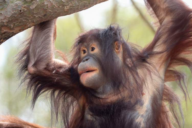 红猩猩是一种非常珍稀的灵长类动物,体型仅次于大猩猩,树栖性,雄性单独生活,雌性单独生活或与小猩猩在一起生活。成年红猩猩的智力相当于人类幼童期的3-5岁,人们把红毛猩猩称作世界上最憨态可掬的哺乳动物。